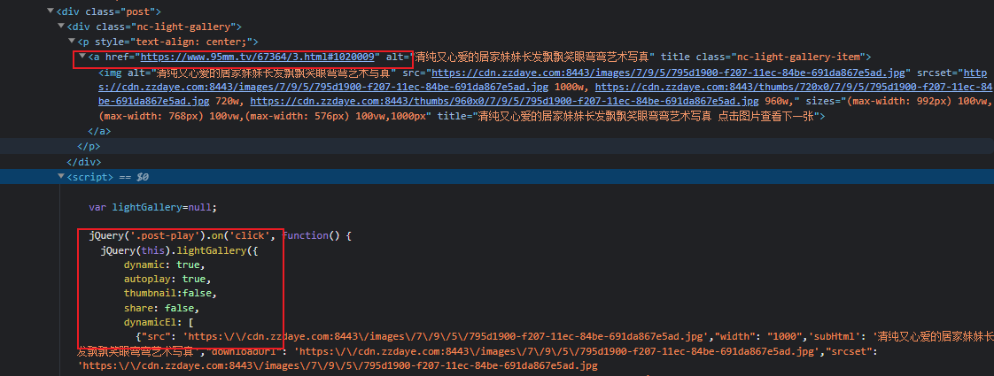 • 点击进入详情页, 发现页面只有一张图片,并没有分页的接口地址或者请求。 仔细向下寻找发现,所有的图片地址隐藏在一段JS脚本中。